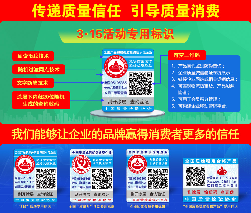 中國質(zhì)量檢驗協(xié)會防偽溯源和物流管理服務(wù)系統(tǒng)(簡稱中檢聯(lián)合質(zhì)量誠信驗證系統(tǒng))是以物聯(lián)網(wǎng)、大數(shù)據(jù)、云計算、區(qū)塊鏈和移動互聯(lián)網(wǎng)技術(shù)為基礎(chǔ)建設(shè)的全過程防偽溯源與質(zhì)量誠信驗證服務(wù)平臺,依托廣大技術(shù)機構(gòu)的技術(shù)支撐,應(yīng)用二維碼為載體,使用一物一碼防偽技術(shù),同時采用文字、圖片和視頻等多媒體方式,完整記錄產(chǎn)品的原料來源、生產(chǎn)加工、倉儲物流和市場銷售等詳細信息,融合實現(xiàn)產(chǎn)品質(zhì)量來源可查、去向可追、責(zé)任可究的全過程追溯,切實方便企業(yè)履行質(zhì)量安全主體責(zé)任并用科技、智能化、信息化的手段去加強質(zhì)量安全風(fēng)險控制,維護消費者合法權(quán)益,讓人民群眾買得放心、吃得放心、用得放心...