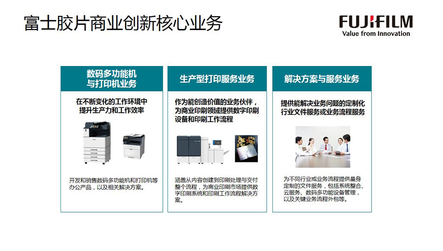 富士膠片商業(yè)創(chuàng)新(中國)有限公司主要向中國市場提供能滿足企業(yè)不同需求的文件管理設(shè)備、解決方案和服務(wù),包括:智能型彩色數(shù)碼多功能機(jī)、激光打印機(jī)/多功能一體機(jī);能滿足個性化、批量打印等需求的數(shù)字印刷系統(tǒng)和大幅面工程系統(tǒng);以及針對企業(yè)文印和業(yè)務(wù)流程等的外包服務(wù)。富士膠片商業(yè)創(chuàng)新(中國)不斷推出采用云、移動、機(jī)器人自動化流程和人工智能等技術(shù)的全行業(yè)數(shù)字化解決方案與服務(wù),為企業(yè)打造數(shù)字化工作空間、數(shù)字化生產(chǎn)力、數(shù)字化工作流程,幫助企業(yè)改善業(yè)務(wù)流程,改變工作方式,加速數(shù)字化轉(zhuǎn)型。該公司在北京、上海、廣州、深圳、沈陽、天津、武漢、成都等城市設(shè)有分支機(jī)構(gòu)。