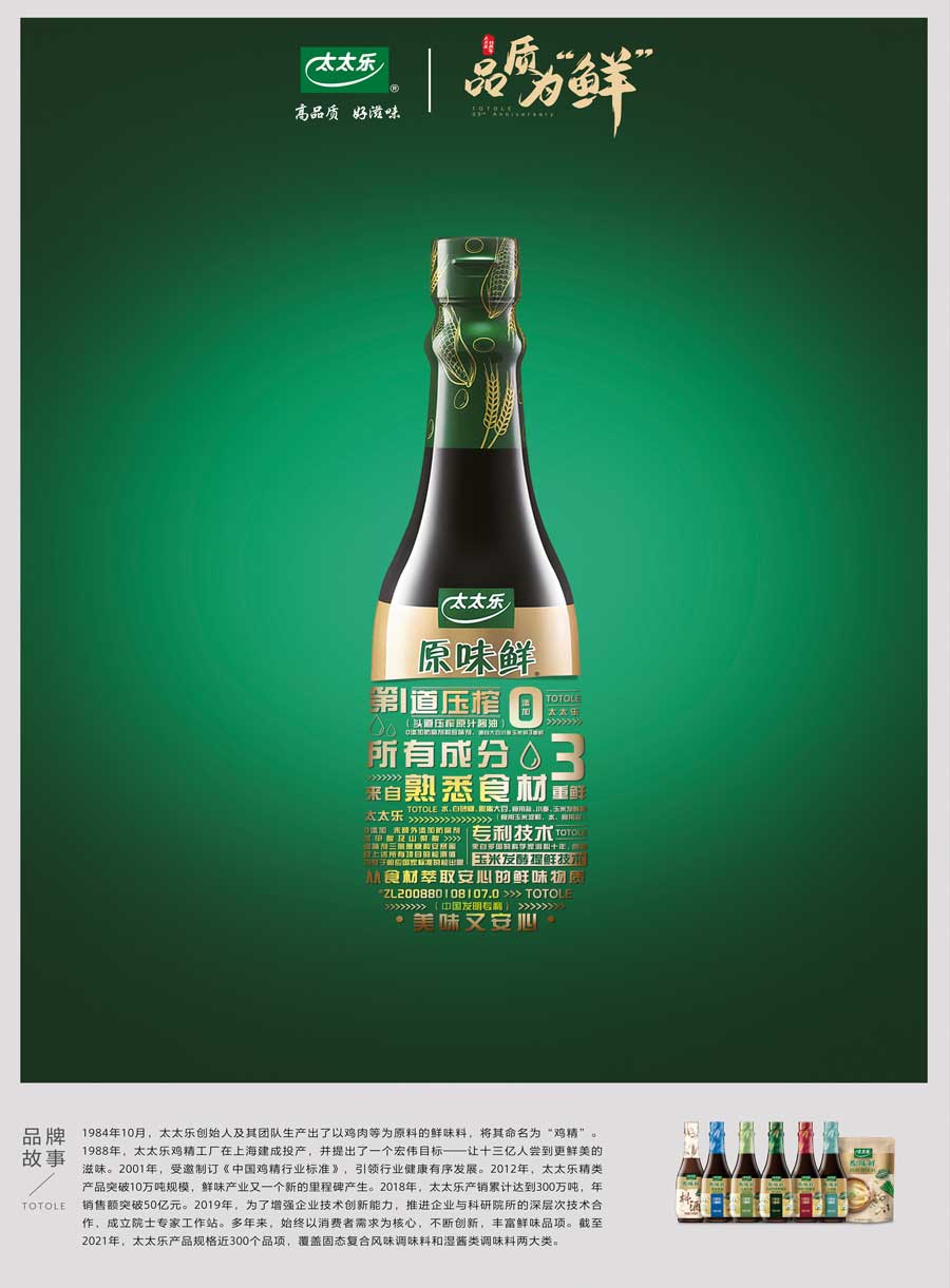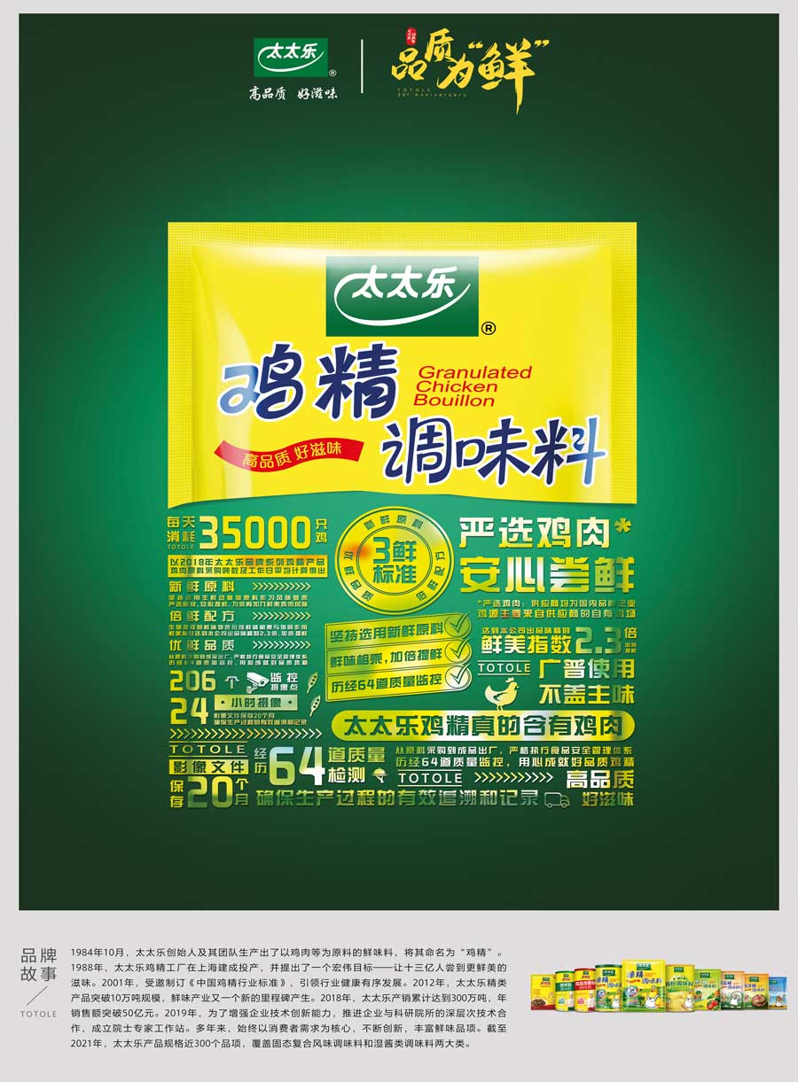 太太樂產(chǎn)品覆蓋固態(tài)復合風味調味料和液態(tài)增鮮調味料兩大類的不同系列,多個子品牌,產(chǎn)品規(guī)格近300個品項。太太樂憑借雀巢體系的國際化管理體制、全球化質量監(jiān)管體系、強大的研發(fā)實力和卓越的員工團隊,依托以餐飲、零售、電商、出口為主的四大銷售渠道,銷售網(wǎng)絡覆蓋全國各地,并出口至美國、加拿大、日本、中東等國家和地區(qū)。作為鮮味科學倡導者,太太樂以“讓十三億人嘗到更鮮美的滋味”為企業(yè)愿景,持續(xù)鮮味行業(yè)革新升級。