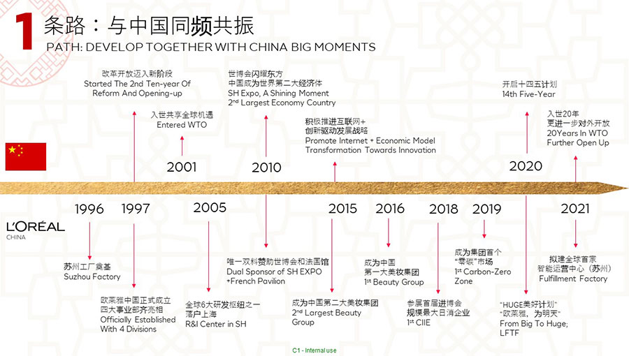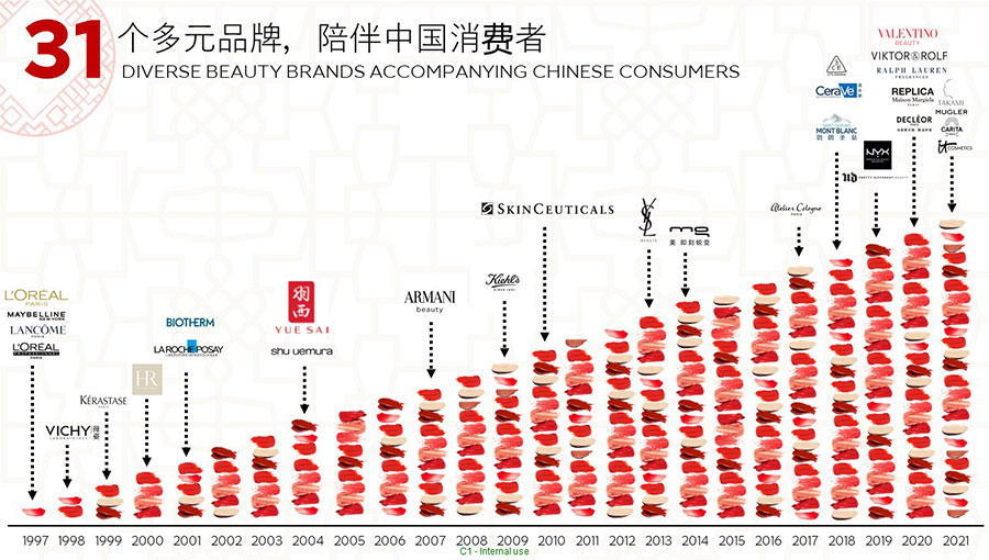 歐萊雅在1997年進(jìn)入中國。歐萊雅中國的總部位于上海,并在全國設(shè)有五個(gè)辦事處,目前在中國擁有31個(gè)品牌,一個(gè)研發(fā)和創(chuàng)新中心,兩家工廠分別位于蘇州和宜昌,共有超過14,000名員工。經(jīng)過25年高質(zhì)量、穩(wěn)健、可持續(xù)的增長(zhǎng),中國已成為歐萊雅集團(tuán)全球第二大市場(chǎng),該集團(tuán)北亞區(qū)美妝黃金三角洲的總部,以及該集團(tuán)美妝科技三大樞紐之一。作為中國最佳企業(yè)公民之一,歐萊雅中國始終貫徹落實(shí)該集團(tuán)提出的“歐萊雅,為明天——可持續(xù)發(fā)展承諾2030”,是該集團(tuán)第1個(gè)完整運(yùn)營設(shè)施“零碳”的市場(chǎng),并積極通過社會(huì)責(zé)任項(xiàng)目,持續(xù)貢獻(xiàn)中國社會(huì)的美好發(fā)展。