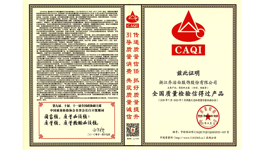 浙江喬治白服飾股份有限公司自創(chuàng)業(yè)以來,堅(jiān)持品牌戰(zhàn)略,通過了ISO9000質(zhì)量管理體系、ISO14001環(huán)境管理體系和OHSAS18000職業(yè)健康安全管理體系認(rèn)證。采用意大利GIUSEPPE公司的設(shè)計(jì)理念,不斷推出糅合經(jīng)典與時(shí)尚的完美產(chǎn)品。