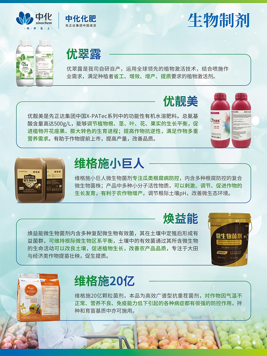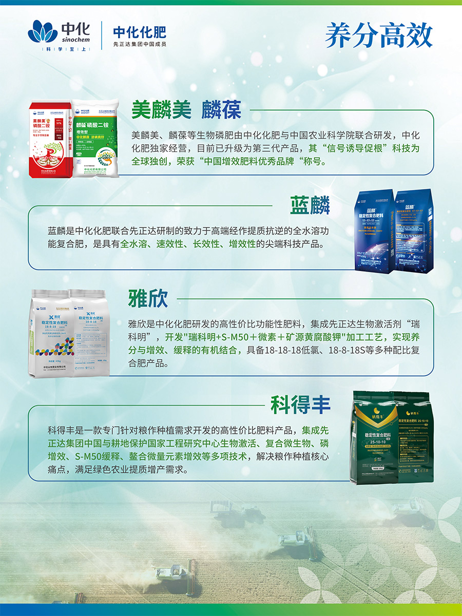 美麟美、麟葆等生物磷肥由中化化肥與中國(guó)農(nóng)業(yè)科學(xué)院聯(lián)合研發(fā),中化化肥獨(dú)家經(jīng)營(yíng),目前已升級(jí)為第三代產(chǎn)品,其“信號(hào)誘導(dǎo)促根”科技為全球獨(dú)創(chuàng),榮獲“中國(guó)增效肥料優(yōu)秀品牌“稱(chēng)號(hào)藍(lán)麟是中化化肥聯(lián)合先正達(dá)研制的致力于高端經(jīng)作提質(zhì)抗逆的全水溶功能復(fù)合肥,是具有全水溶、速效性、長(zhǎng)效性、增效性的尖端科技產(chǎn)品。