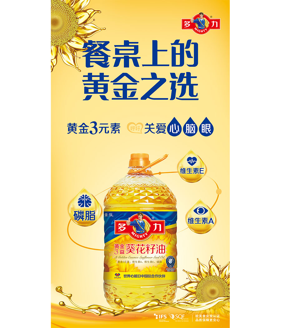 佳格集團以健康營養(yǎng)的“多力”葵花籽油為起點切入食用油市場,深耕市場20年后,佳格已擁有現代化的研發(fā)中心、支持全國的內蒙、太倉及廈門三大生產基地,以及遍布各地的業(yè)務網點。截至目前,“多力”食用油系列涵蓋葵花籽油、菜籽油、壓榨玉米油等多款產品,以其獨有的7重精煉技術、享譽國際的品質標準以及倡導國人健康的品牌理念,深得廣大消費者信賴并成為中國食用油市場領導品牌。