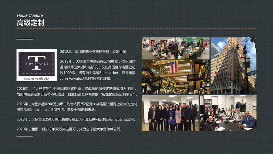 大楊集團(tuán)主要從事生產(chǎn)和銷(xiāo)售各類(lèi)中高檔服裝產(chǎn)品,以西裝縫制享譽(yù)全球。年服裝綜合生產(chǎn)加工能力1100萬(wàn)件/套,年西服出口量600萬(wàn)件/套,年服裝定制產(chǎn)量200萬(wàn)件/套,連續(xù)多年排名全國(guó)第一,是全球重要的西裝生產(chǎn)基地。