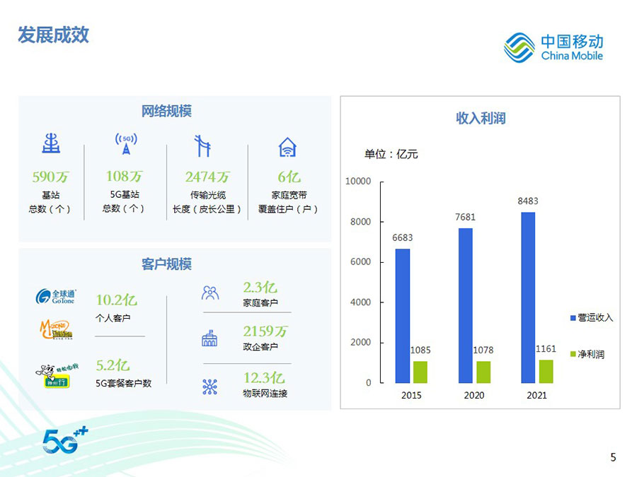 2022年,中國移動全年營運收入達到人民幣9,373億元,同比增長10.5%,其中通信服務(wù)收入達到人民幣8,121億元,同比增長8.1%。CHBN客戶規(guī)模、收入規(guī)模全面增長,HBN收入占通信服務(wù)收入比達到39.8%,同比提升4.1個百分點。得益于5G應(yīng)用、移動云、數(shù)字內(nèi)容、智慧家庭等業(yè)務(wù)的快速拓展,數(shù)字化轉(zhuǎn)型收入達到人民幣2,076億元,同比增長30.3%。整體來看,公司著力打造的數(shù)字化轉(zhuǎn)型收入增長“第二曲線”卓有成效,收入結(jié)構(gòu)更加均衡穩(wěn)健,可持續(xù)增長動能不斷增強,抗風(fēng)險能力顯著提升。