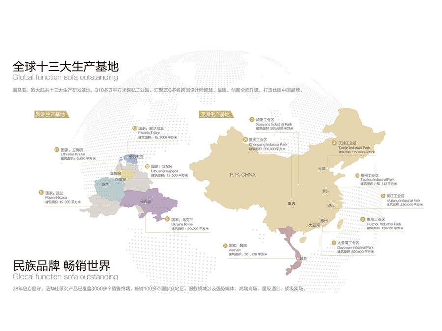 在全球設有多家子公司、分公司及關(guān)聯(lián)公司,運營網(wǎng)絡橫跨亞、美、歐、澳四大洲,擁有超過8000個銷售終端,產(chǎn)品暢銷中國、美國、英國、加拿大等100多個國家及地區(qū),旗下“CHEERS”、“芝華仕”和“頭等艙”品牌專賣店超過8000家,形成了體系完備的全球跨國發(fā)展大格局,已成為集研發(fā)、制造、銷售和服務于一體的國際化智能家居企業(yè)。