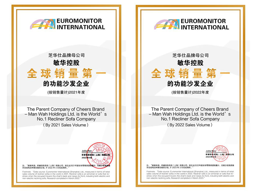 沙利文(Frost&Sullivan)數(shù)據(jù)顯示,在中國功能沙發(fā)市場上,芝華仕品牌在中國功能沙發(fā)零售市場占有率從2018年的45.3%上升至2019年的50.1%,位列前茅;2010年至2023年已經(jīng)連續(xù)13年在中國功能沙發(fā)零售市場占有率前茅;2021年(據(jù)歐睿國際數(shù)據(jù))、2022年(據(jù)沙利文數(shù)據(jù))芝華仕母公司敏華控股榮獲“全球銷量第一的功能沙發(fā)企業(yè)”。