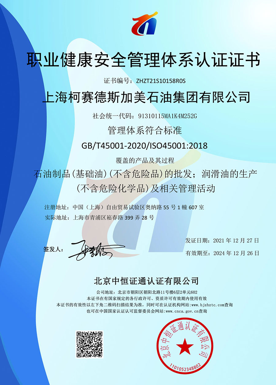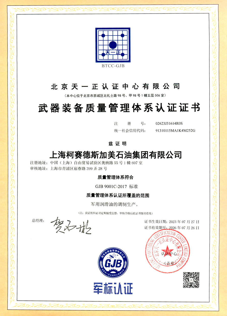 柯賽德斯集團(tuán)公司統(tǒng)一遵循嚴(yán)格的質(zhì)量保證體系,先后通過了武器裝備質(zhì)量管理體系認(rèn)證GJB9001C-2017、ISO/TS16949、IS09001質(zhì)量體系認(rèn)證、1S014001環(huán)境體系認(rèn)證及ISO45001:2018職業(yè)健康安全管理體系認(rèn)證。隨著業(yè)務(wù)領(lǐng)域的不斷擴(kuò)展,目前柯賽德斯集團(tuán)公司先后與多家世界能源、化工方面的巨頭建立了產(chǎn)品服務(wù)、供應(yīng)保障、技術(shù)合作、技術(shù)特別支持單位等方面的戰(zhàn)略合作關(guān)系。今天,柯賽德斯集團(tuán)旗下管理著三大潤(rùn)滑油品牌,實(shí)現(xiàn)了經(jīng)營(yíng)上的多元化戰(zhàn)略格局。