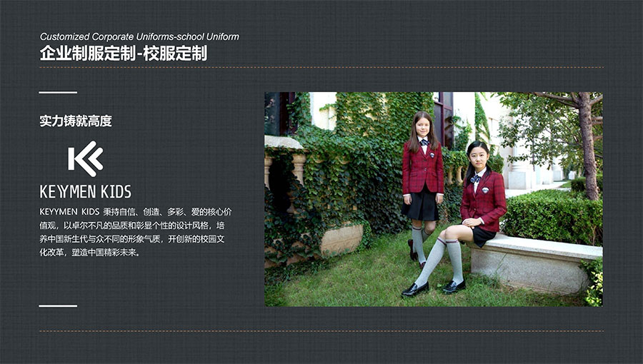 凱門學(xué)生裝(KEYYMEN KIDS)秉持自信、創(chuàng)造、多彩、愛的核心價(jià)值觀,堅(jiān)持“領(lǐng)先一步,步步領(lǐng)先”的品牌理念,致力于打造最具影響力的學(xué)生裝品牌,為中國(guó)青少年形象代言,以卓爾不凡的品質(zhì)和彰顯個(gè)性的設(shè)計(jì)風(fēng)格,培養(yǎng)中國(guó)青少年與眾不同的形象氣質(zhì)。