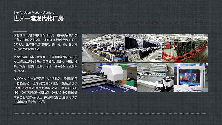 多年來,大楊集團(tuán)深耕主業(yè)、堅(jiān)守實(shí)業(yè),積極開拓國(guó)內(nèi)外高端服裝市場(chǎng),年服裝綜合生產(chǎn)加工能力1100萬件/套,其中年定制服裝生產(chǎn)數(shù)量穩(wěn)居全球第一。年西服出口量600萬件/套,連續(xù)多年排名全國(guó)第一。先后被評(píng)為世界服裝行業(yè)五百強(qiáng)企業(yè)、全國(guó)服裝行業(yè)十強(qiáng)/百強(qiáng)企業(yè)、國(guó)家重點(diǎn)扶持的中國(guó)名牌出口企業(yè)、國(guó)家級(jí)重合同守信譽(yù)單位、國(guó)家級(jí)服務(wù)型制造示范企業(yè)、國(guó)家重點(diǎn)培育紡織服裝百家品牌、遼寧省數(shù)字化轉(zhuǎn)型標(biāo)桿企業(yè),榮獲全國(guó)五一勞動(dòng)獎(jiǎng)狀、全國(guó)文明單位、全國(guó)紡織行業(yè)先進(jìn)集體、全國(guó)抗擊新冠肺炎疫情先進(jìn)民營(yíng)企業(yè)、省長(zhǎng)質(zhì)量獎(jiǎng)等稱號(hào),入選“中國(guó)服裝智能制造技術(shù)創(chuàng)新戰(zhàn)略聯(lián)盟”創(chuàng)始會(huì)員。同時(shí),大楊集團(tuán)還在同行業(yè)中率先通過“AAA級(jí)兩化融合管理體系”評(píng)定,以及ISO9001質(zhì)量管理體系國(guó)際認(rèn)證、國(guó)際準(zhǔn)入的ISO14001環(huán)境管理體系認(rèn)證、ISO45001職業(yè)健康安全管理體系認(rèn)證。