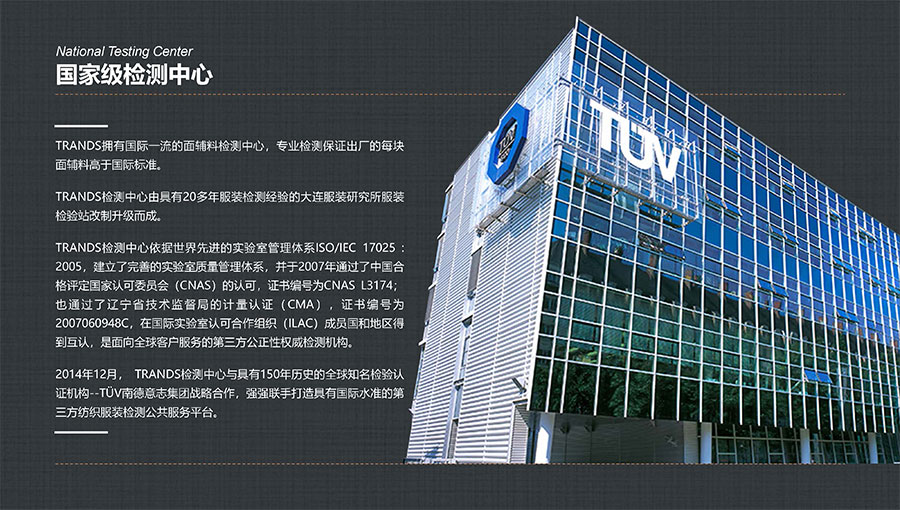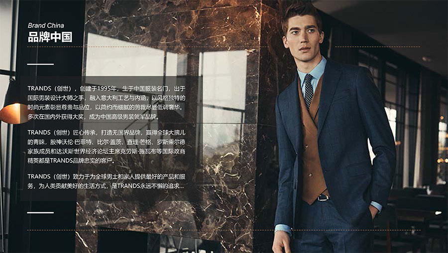 創(chuàng)世品牌(TRANDS):創(chuàng)建于1995年,是當(dāng)今中國(guó)高級(jí)男裝的代表品牌之一。TRANDS創(chuàng)世成衣產(chǎn)品及量身定制的西裝以其至臻品質(zhì)和精湛工藝,贏得眾多國(guó)際政商精英多年來的青睞。