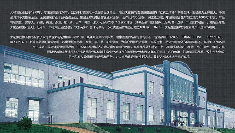 大楊集團(tuán)創(chuàng)建于1979年,總部位于遼寧省大連市,主要生產(chǎn)和銷售各類中高檔服裝產(chǎn)品為主的國(guó)際化大型服裝企業(yè),以西裝縫制享譽(yù)全球,是世界重要的西裝生產(chǎn)加工基地。現(xiàn)有直屬(控股)成員企業(yè)20家,員工4500人??毓勺庸敬筮B大楊創(chuàng)世股份有限公司2000年在上海證券交易所上市,并于2016年完成重大資產(chǎn)重組。