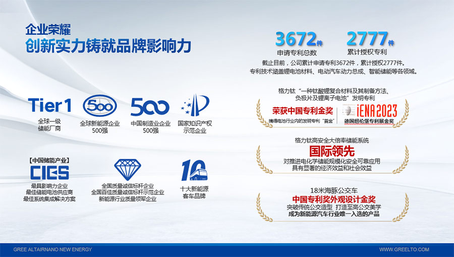 2022年,“一種鈦酸鋰復(fù)合材料及其制備方法、負(fù)極片及鋰離子電池”發(fā)明專利獲得中國專利金獎,摘得鋰電池行業(yè)內(nèi)的發(fā)明專利“首金”;2023年,該專利技術(shù)再次斬獲第75屆德國紐倫堡發(fā)明國際金獎。“高安全大倍率儲能系統(tǒng)關(guān)鍵技術(shù)研發(fā)與應(yīng)用”項目被中國機械工業(yè)聯(lián)合會鑒定達到“國際領(lǐng)先”水平。截至目前,格力鈦先后獲得“中國民營企業(yè)制造業(yè)500強”、“全國質(zhì)量信得過產(chǎn)品”、“客車安全技術(shù)成果獎”、“中國儲能產(chǎn)業(yè)最具影響力企業(yè)獎、最佳系統(tǒng)集成商、最佳儲能電池供應(yīng)商”等榮譽,獲得工信部頒發(fā)的“綠色工廠”榮譽稱號;上榜科技部發(fā)布的新能源領(lǐng)域獨角獸企業(yè),多年入選全球新能源企業(yè)500強,入選“全國百佳質(zhì)量檢驗誠信標(biāo)桿企業(yè)”、“國家知識產(chǎn)權(quán)優(yōu)勢企業(yè)”等。