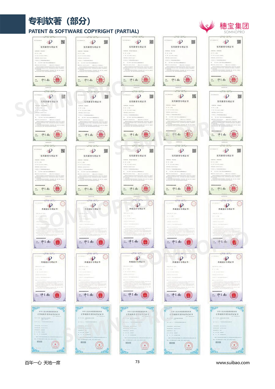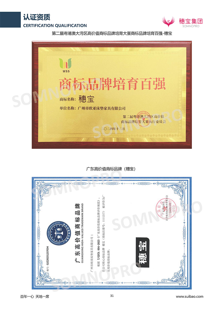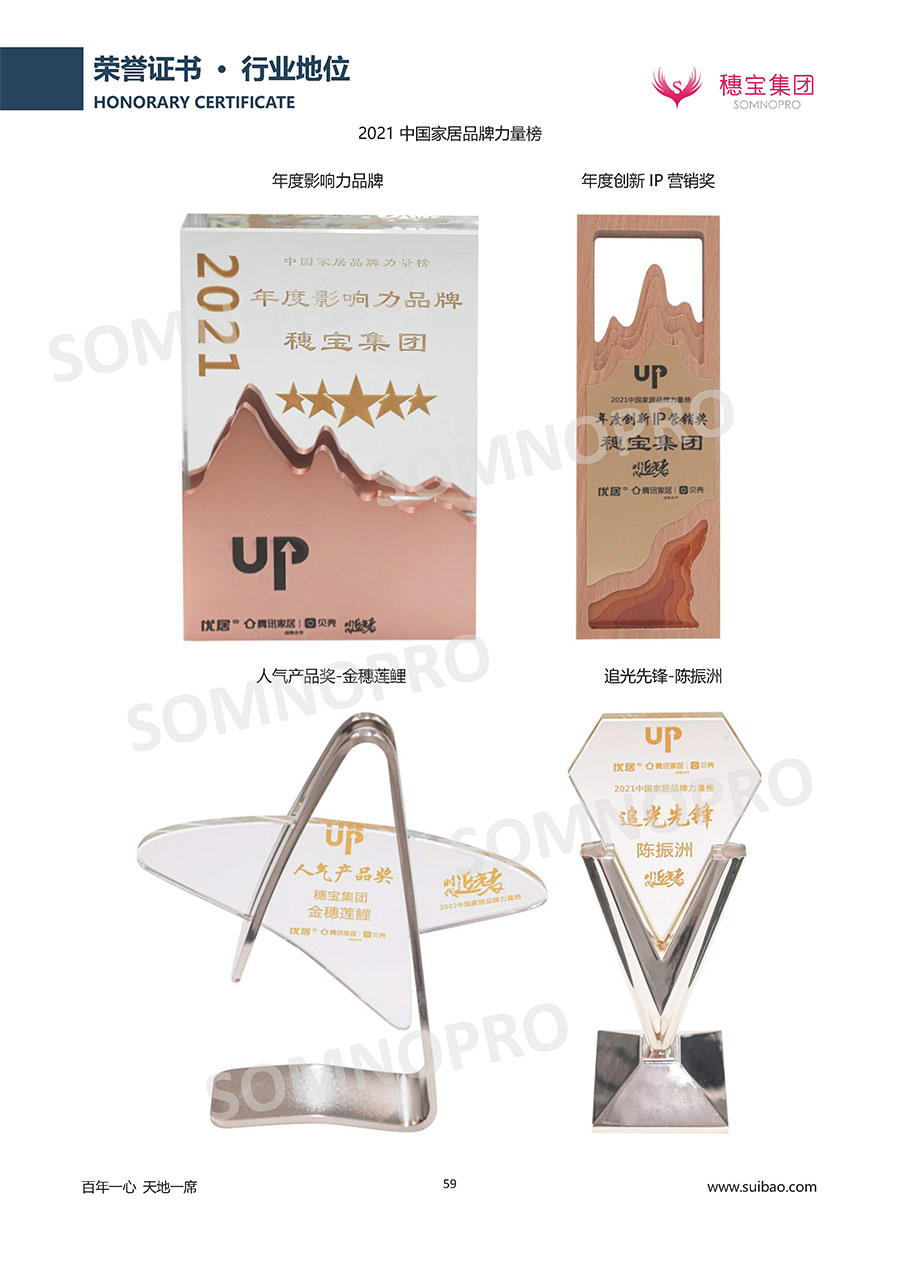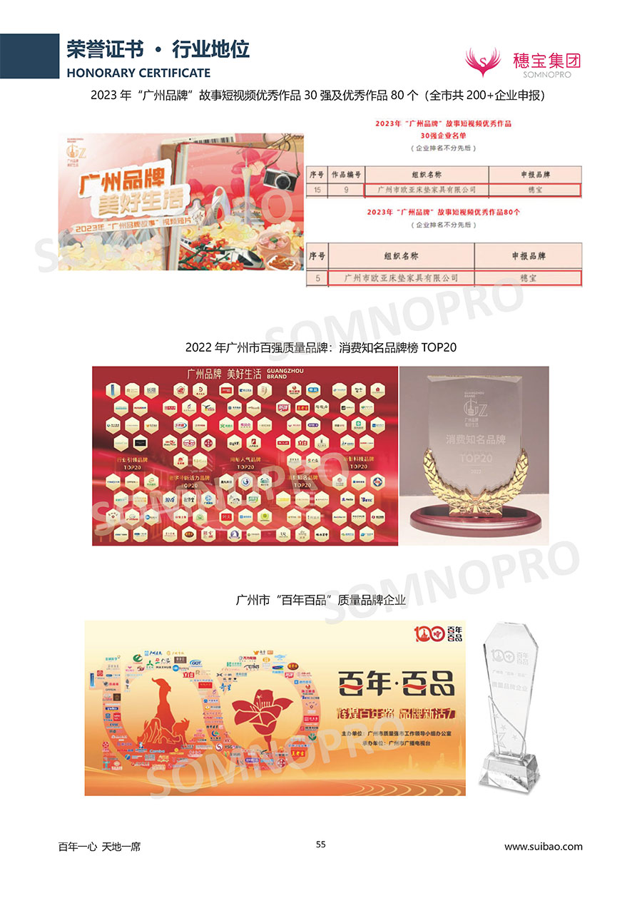 自1971年獨(dú)立研發(fā)生產(chǎn)出專(zhuān)屬?lài)?guó)人的彈簧床墊,穗寶關(guān)于優(yōu)質(zhì)深度睡眠的研究已有半個(gè)世紀(jì)的歷史。穗寶一直專(zhuān)注床墊,專(zhuān)注中國(guó)消費(fèi)者的睡眠研究,針對(duì)中國(guó)人特點(diǎn)進(jìn)行優(yōu)化創(chuàng)新,不斷提升國(guó)人的睡眠體驗(yàn),只為成就每個(gè)晚上8小時(shí)的優(yōu)質(zhì)深度睡眠。憑借不斷革新的研發(fā)科技和深受消費(fèi)者信賴(lài)的產(chǎn)品品質(zhì),穗寶集團(tuán)旗下品牌和產(chǎn)品屢獲國(guó)內(nèi)外大獎(jiǎng),連續(xù)20年榮膺中國(guó)500最具價(jià)值品牌,品牌價(jià)值高達(dá)302.89億元。