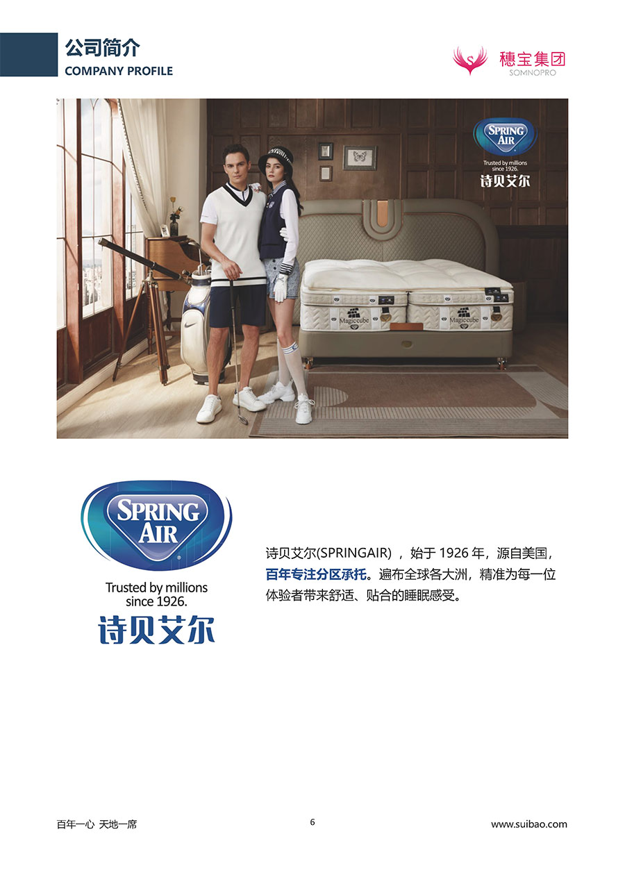 半個(gè)世紀(jì)的付出,穗寶集團(tuán)在深度睡眠領(lǐng)域收獲非凡成就,贏得業(yè)界與社會(huì)的一致贊譽(yù)。作為大家居行業(yè)的品質(zhì)倡導(dǎo)者,穗寶集團(tuán)不斷創(chuàng)新,豐富品牌實(shí)力,致力推動(dòng)中國(guó)床墊產(chǎn)業(yè)發(fā)展。至今,穗寶集團(tuán)旗下?lián)碛卸鄠€(gè)來(lái)自世界各地的優(yōu)質(zhì)品牌,包括:穗寶、詩(shī)貝艾爾、百納璐詩(shī)、睡客小鎮(zhèn)、Mr.Z早先生等;此外,穗寶集團(tuán)從世界各地甄選適合不同消費(fèi)者的優(yōu)質(zhì)睡眠產(chǎn)品,定制屬于您的睡眠空間。如今,穗寶集團(tuán)形成以研發(fā)、生產(chǎn)和銷(xiāo)售床墊為主營(yíng)業(yè)務(wù),涉及家具、家居裝飾、酒店配套等多項(xiàng)業(yè)務(wù)的企業(yè)群體。