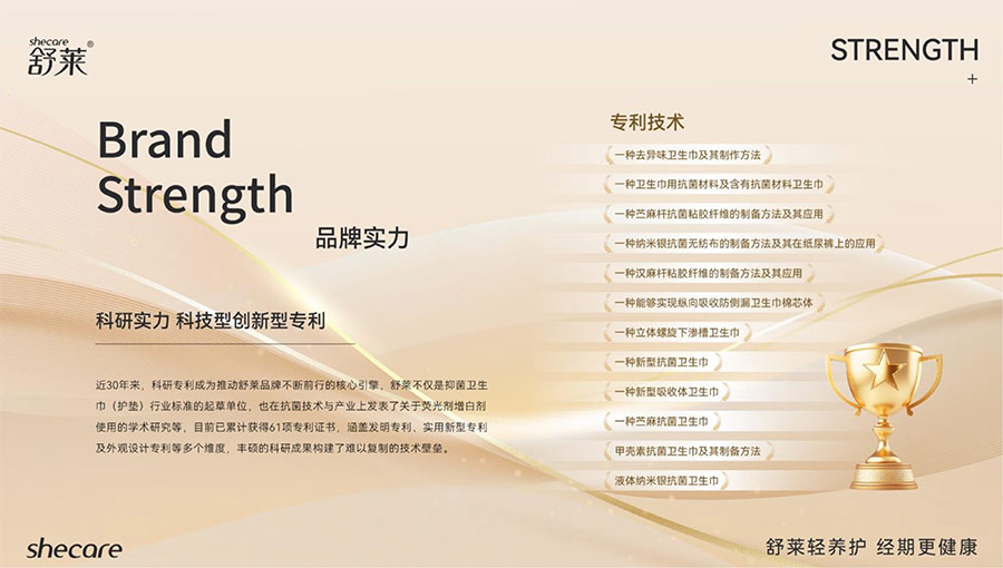 舒萊作為抑菌衛(wèi)生巾行業(yè)標(biāo)準(zhǔn)起草單位,目前累計(jì)擁有61項(xiàng)國(guó)家專利(含發(fā)明專利、實(shí)用新型及外觀專利),也在抗菌技術(shù)與產(chǎn)業(yè)上發(fā)表了關(guān)于熒光劑增白劑使用的學(xué)術(shù)研究等,構(gòu)建了難以復(fù)制的技術(shù)壁壘。