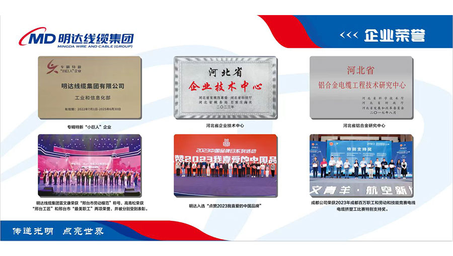 明達(dá)線纜先后被評(píng)為中國線纜企業(yè)百強(qiáng)、礦用橡套電纜企業(yè)十強(qiáng)、中國最具投標(biāo)實(shí)力電線電纜供應(yīng)商百強(qiáng),國家高新技術(shù)企業(yè)、國家級(jí)專精特新小巨人企業(yè)、國家守合同重信用企業(yè)、全國質(zhì)量誠信示范企業(yè)、點(diǎn)贊2023我喜愛的中國品牌、全國用戶滿意星級(jí)產(chǎn)品、河北省民營(yíng)企業(yè)百強(qiáng)、河北省誠信企業(yè)、河北省產(chǎn)業(yè)集群龍頭企業(yè)、河北省企業(yè)技術(shù)中心、河北省制造業(yè)單項(xiàng)冠軍(鋁合金電纜)、河北省企業(yè)標(biāo)準(zhǔn)領(lǐng)跑者、河北省級(jí)標(biāo)準(zhǔn)化良好行為試點(diǎn)企業(yè)、河北省安全生產(chǎn)標(biāo)準(zhǔn)化企業(yè)、邢臺(tái)市政府質(zhì)量獎(jiǎng)、邢臺(tái)市智能電網(wǎng)及輸配電裝備產(chǎn)業(yè)鏈鏈主企業(yè)、邢臺(tái)市電線電纜協(xié)會(huì)會(huì)長(zhǎng)單位等多項(xiàng)資質(zhì)榮譽(yù)。