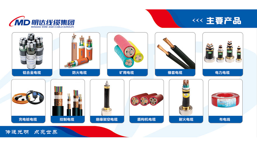 主要產(chǎn)品:“明達(dá)”牌鋁合金電纜、防火電纜、礦用電纜、橡套電纜、電力電纜、充電樁電纜及連接裝置、控制電纜、布電線、架空絕緣電纜、盾構(gòu)機(jī)電纜、耐火電纜等線纜產(chǎn)品