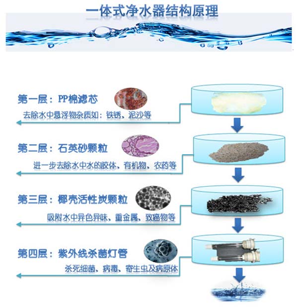 鄧凈公司主打產(chǎn)品,鄧凈牌凈水機(jī)YCZ-QT8-DJ01。鄧凈凈水機(jī)YCZ-QT8-DJ01以生物慢濾為原型,采用純物理凈化原理和漸進(jìn)式結(jié)構(gòu)即纖維素濾芯+石英石+活性炭+紫外線消毒四級(jí)過(guò)濾,通過(guò)截留、沉降、吸附和殺菌等作用,有效地凈化水源,改善飲用水安全。