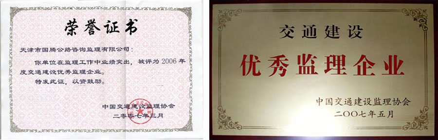 由于工作業(yè)績突出,1999年公司被評為行業(yè)“九五”立功先進單位,2000年獲得“九五”全國干線公路檢查評比立功單位,2001年被評為公路系統(tǒng)文明窗口,2002年被評為行業(yè)文明創(chuàng)建達標單位,2003年至2005年被評為先進監(jiān)理單位,2006年被評為公路行業(yè)“十五”期文明服務品牌、“交通建設優(yōu)秀監(jiān)理企業(yè)”,2000年至2007年連續(xù)被評為公路局先進單位、公路系統(tǒng)文明窗口;連續(xù)八年五年獲得公路局“優(yōu)秀領導班子”的榮譽稱號。