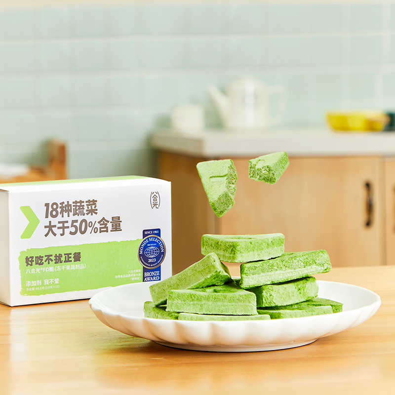 隨著育兒觀念、消費(fèi)意識(shí)的轉(zhuǎn)變,新生代父母在兒童零食上,不僅看重天然健康,還要對(duì)孩子身體的成長發(fā)育有益。為了滿足這屆父母對(duì)兒童零食的新需求,2022年底,八合光兒童零食品牌率先推出了一款含有“18種蔬菜”的蔬菜凍干機(jī)能零食——八合光FD脆。