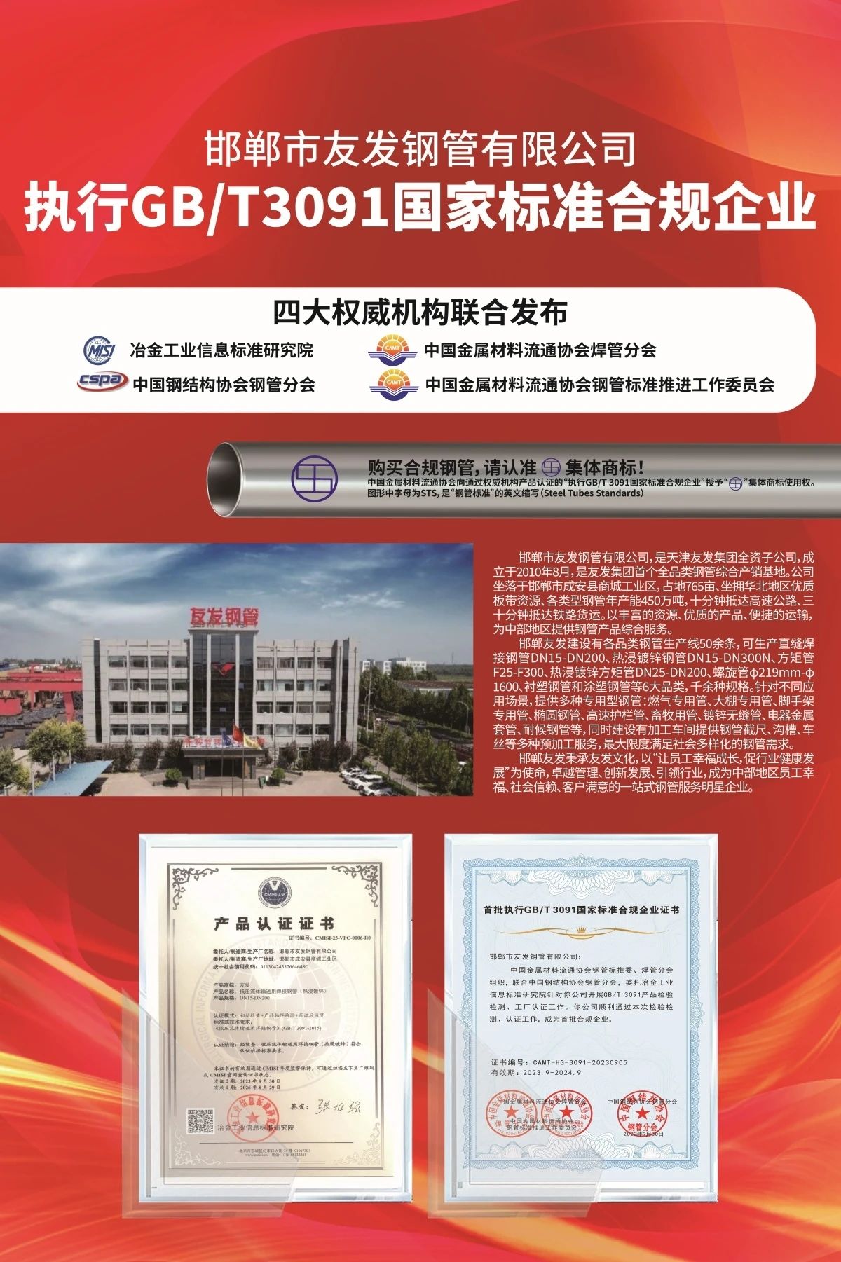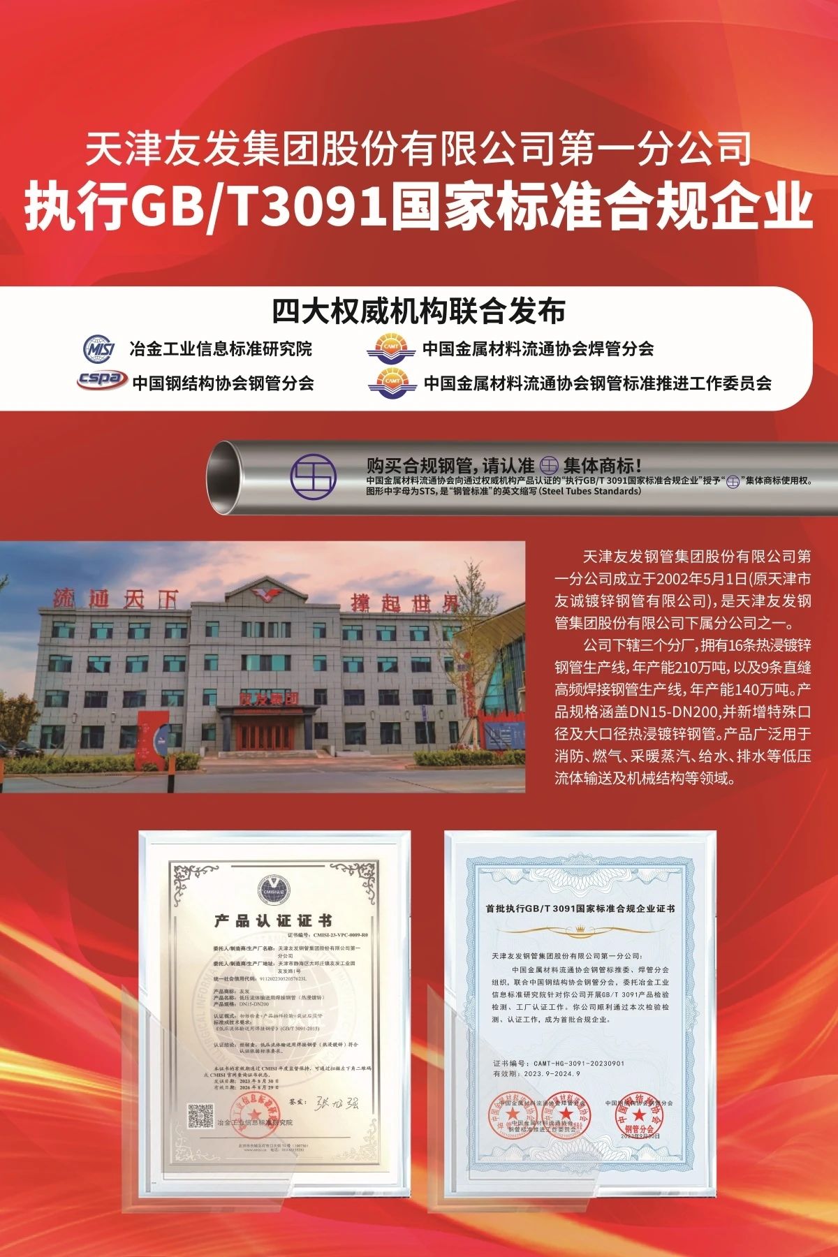 10月16日,由四大權(quán)威機(jī)構(gòu)聯(lián)合發(fā)布的首批入圍《執(zhí)行GB/T 3091國(guó)家標(biāo)準(zhǔn)合規(guī)企業(yè)名錄》的14家企業(yè)中,有5家為友發(fā)集團(tuán)旗下企業(yè)。分別為友發(fā)集團(tuán)第一分公司、唐山正元管業(yè)、邯鄲友發(fā)、陜西友發(fā)和江蘇友發(fā),涵蓋友發(fā)集團(tuán)全部鍍鋅圓管產(chǎn)品。