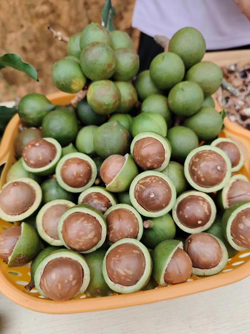 樹上,一串串咖啡色的堅果掛滿枝,陣陣飄香;樹下,果農(nóng)來回穿梭采摘忙。