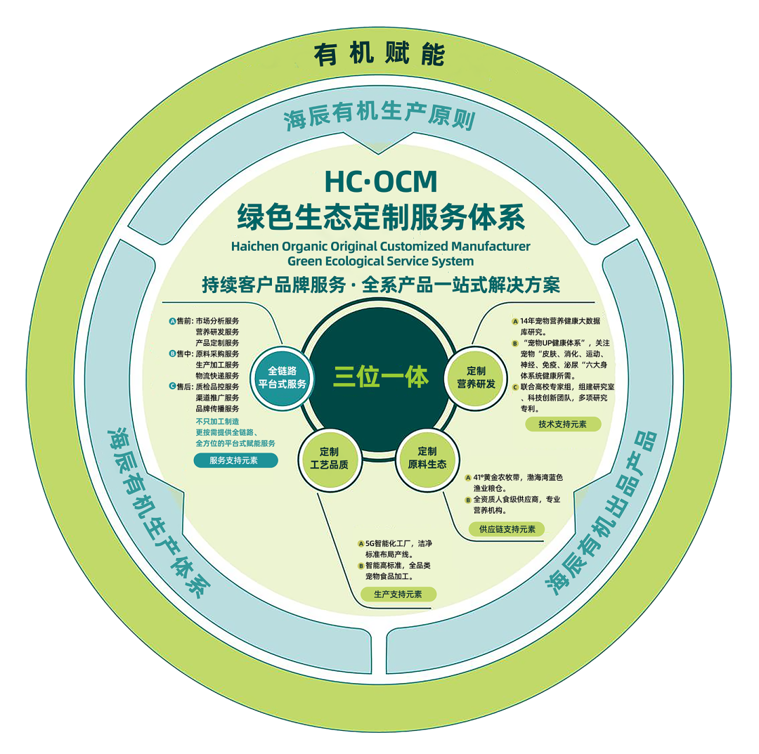以品牌客戶的市場人群、寵物營養(yǎng)、產(chǎn)品功能三大需求為根本出發(fā)點(diǎn),全力打造包含定制配方研發(fā)、定制生態(tài)原料、定制生產(chǎn)工藝、全鏈路平臺式服務(wù)四大方面在內(nèi)的海辰OCM綠色生態(tài)定制服務(wù)體系,致力于向品牌客戶提供值得信賴、更高品質(zhì)、強(qiáng)市場競爭力的品牌定制化產(chǎn)品開發(fā)與智造生產(chǎn)。