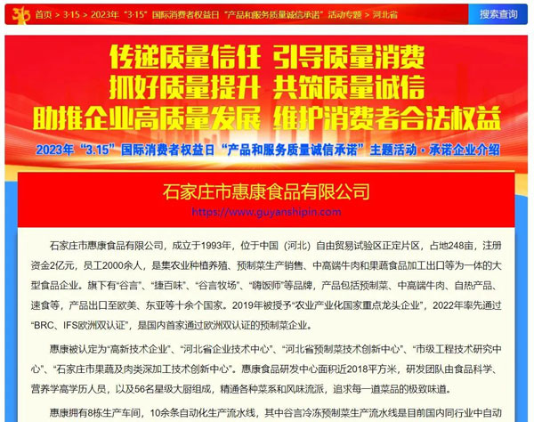 傳遞質(zhì)量信任,引導(dǎo)質(zhì)量消費(fèi),近日,由中國(guó)質(zhì)量檢驗(yàn)協(xié)會(huì)主辦的2023年3·15國(guó)際消費(fèi)者權(quán)益日“產(chǎn)品和服務(wù)質(zhì)量誠(chéng)信承諾”主題活動(dòng)順利召開。在本次活動(dòng)中,石家莊市惠康食品有限公司憑借優(yōu)質(zhì)的產(chǎn)品質(zhì)量及誠(chéng)信經(jīng)營(yíng)榮膺“全國(guó)產(chǎn)品和服務(wù)質(zhì)量誠(chéng)信示范企業(yè)”,““全國(guó)預(yù)制菜行業(yè)質(zhì)量領(lǐng)先企業(yè) ”,公司旗下谷言預(yù)制菜系列產(chǎn)品榮獲“全國(guó)消費(fèi)者質(zhì)量信譽(yù)保障產(chǎn)品”榮譽(yù)。為營(yíng)造公平、公正、誠(chéng)信經(jīng)營(yíng)的市場(chǎng)環(huán)境,樹立質(zhì)量標(biāo)桿、弘揚(yáng)質(zhì)量先進(jìn)做出了表率作用。