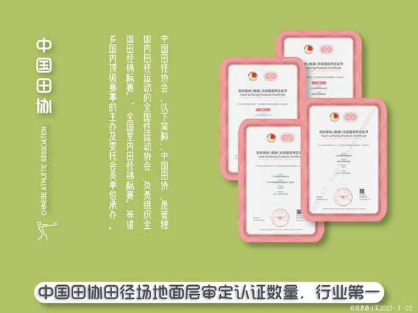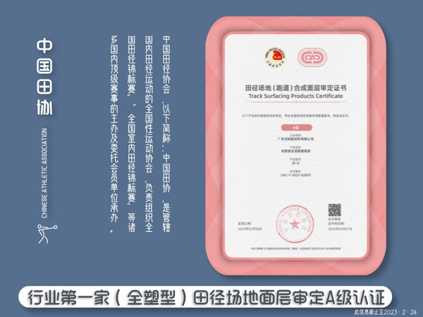 杰銳體育獲全塑型田協(xié)審定A級(jí);面層審定數(shù)量眾多;世界田徑面層系統(tǒng)認(rèn)證數(shù)量國內(nèi)名列前茅!