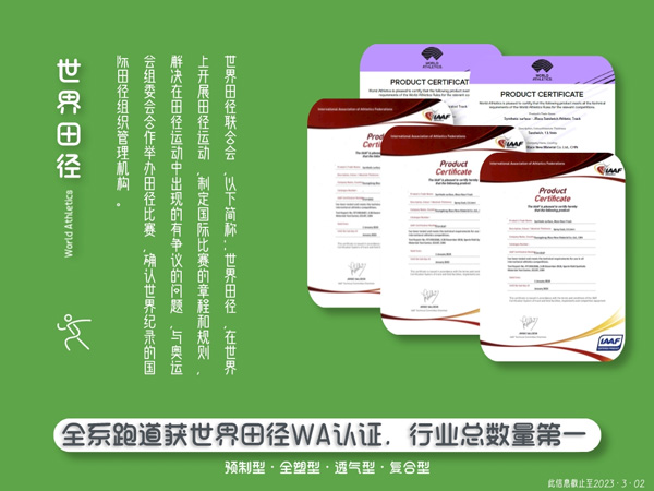 榮獲WA認(rèn)證的運(yùn)動(dòng)地材產(chǎn)品,意味著國際田聯(lián)的背書和肯定,在品質(zhì)、使用體驗(yàn)、安全性等諸多方面達(dá)到國際專業(yè)競(jìng)賽要求。