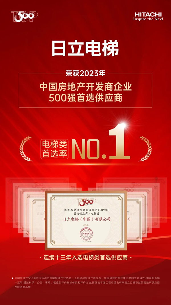 3月23日,2023房地產開發(fā)企業(yè)綜合實力測評成果正式發(fā)布, “2023中國房地產開發(fā)企業(yè)綜合實力TOP500”“TOP500房企首選供應商”等測評榜單揭曉,日立電梯以電梯品牌首選率18%,再次位居中國房地產Top500首選電梯類供應商榜首。