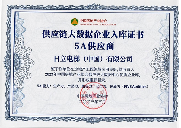 同時,日立電梯憑借在“生產力、產品力、服務力、交付力、創(chuàng)新力”的出色表現,成為中國房地產業(yè)協會供應鏈大數據中心“5A供應商” 入庫企業(yè)。