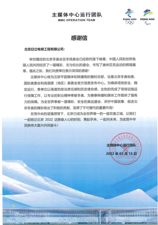 日立電梯還為第24屆北京冬季奧林匹克運動會兩大賽區(qū)6大場館、提供了超過200臺電扶梯產(chǎn)品,包括唯一新建冰上競賽場館“冰絲帶”,并且在長達兩個多月的駐點保障期間達成零故障護航目標(biāo),贏得冬奧組委的認可。