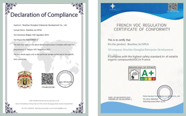 皇氏工匠美縫產(chǎn)品擁有非常全的環(huán)保檢測(cè)項(xiàng)目,不僅通過(guò)國(guó)內(nèi)數(shù)項(xiàng)權(quán)威環(huán)保檢測(cè),還獲得了多項(xiàng)國(guó)際環(huán)保認(rèn)證,包括法國(guó)A+認(rèn)證、比利時(shí)皇家認(rèn)證、德國(guó)AgBB等。