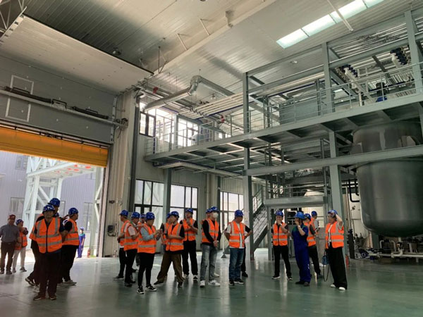 在李艷國董事長、生產(chǎn)部經(jīng)理王建成等領(lǐng)導(dǎo)的陪同下,商學(xué)院觀摩團(tuán)先后參觀了新廠的基礎(chǔ)油儲罐區(qū)、實驗中心、潤滑油調(diào)和設(shè)備及灌裝生產(chǎn)線、潤滑脂調(diào)和設(shè)備、金屬加工油液/防凍液/尿素溶液的生產(chǎn)工藝及設(shè)備。