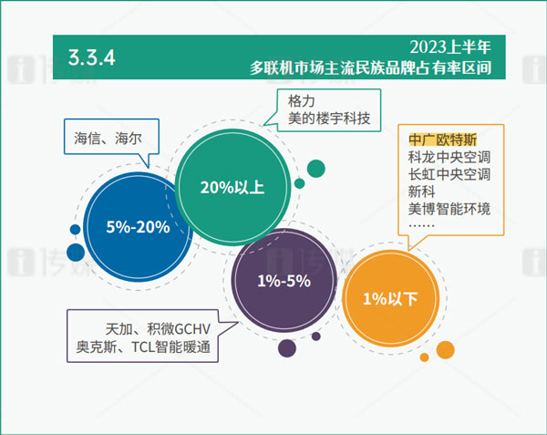 作為中央空調(diào)市場(chǎng)的絕對(duì)權(quán)重品類,多聯(lián)機(jī)一直以來都能以一己之力決定行業(yè)的風(fēng)向,而2023上半年,多聯(lián)機(jī)市場(chǎng)的走勢(shì)與行業(yè)大勢(shì)卻呈現(xiàn)相悖的局面,下滑4.2%。其下滑走勢(shì)的原因與房產(chǎn)經(jīng)濟(jì)走勢(shì)緊密相關(guān)。在品牌陣營(yíng)上,國(guó)產(chǎn)陣營(yíng)、歐美陣營(yíng)以及日韓陣營(yíng)組成了中國(guó)中央空調(diào)行業(yè)的三大陣容,且愈發(fā)穩(wěn)固。其中,國(guó)產(chǎn)陣營(yíng)穩(wěn)穩(wěn)占據(jù)著超過一半的市場(chǎng)份額,擁有后發(fā)優(yōu)勢(shì)的中廣歐特斯通過兩年時(shí)間的沖刺,已在其中占有一席之地。