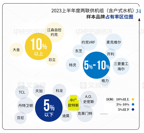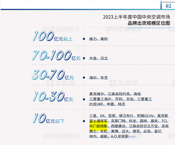 經(jīng)過多年的發(fā)展,中國(guó)中央空調(diào)市場(chǎng)的品牌格局基本穩(wěn)定。結(jié)合2023上半年各品牌的市場(chǎng)表現(xiàn),該報(bào)告將品牌出貨規(guī)模區(qū)位分為5大陣營(yíng),其中,中廣歐特斯在10億元以下規(guī)模榜上有名。