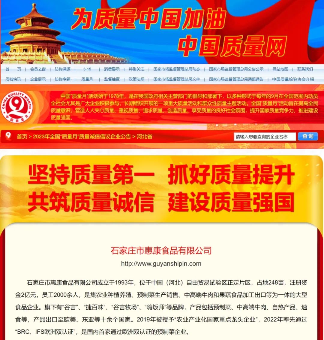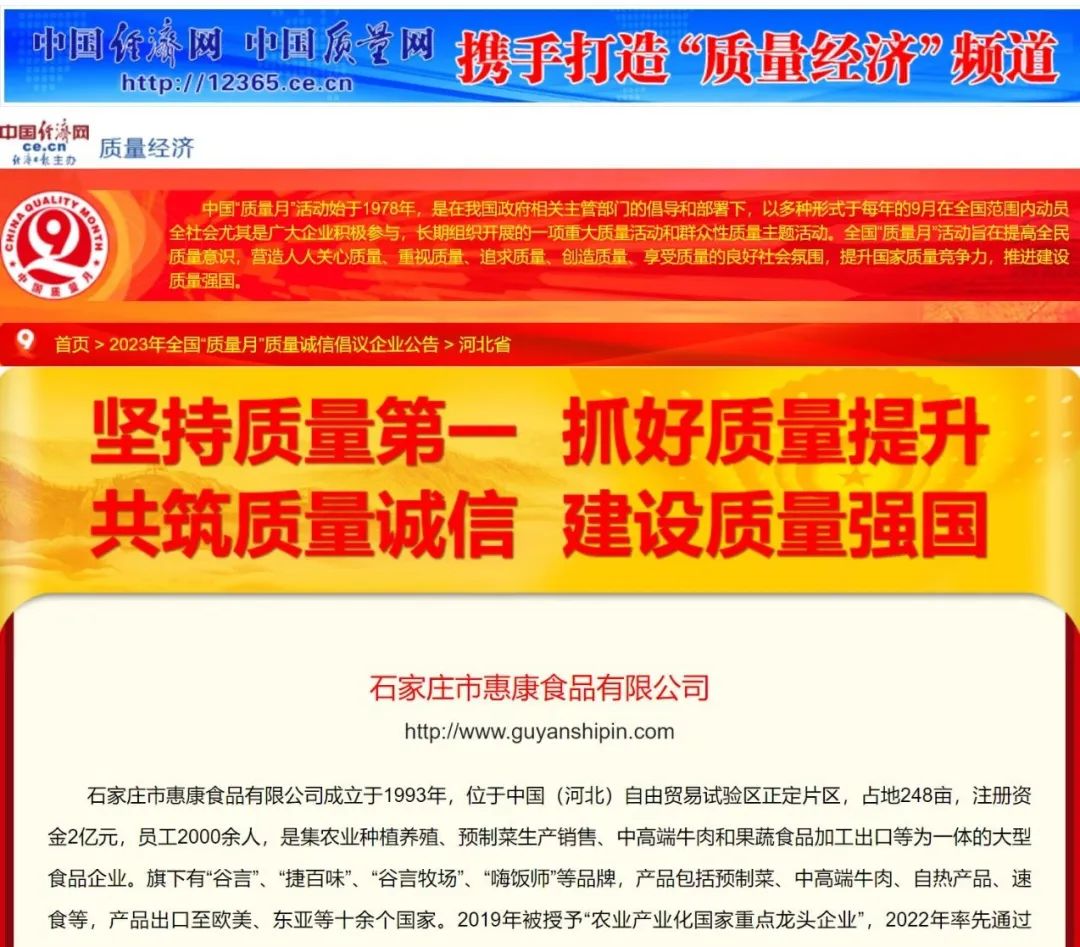 近日,石家莊市惠康食品有限公司再傳捷報,在中國質(zhì)量檢驗協(xié)會組織開展的2023年全國“質(zhì)量月”專題活動中,深耕食品制造行業(yè)30年的惠康食品,憑借過硬的產(chǎn)品質(zhì)量再次被授予“全國質(zhì)量誠信標(biāo)桿企業(yè)”?!吨袊|(zhì)量網(wǎng)》、《中國經(jīng)濟(jì)網(wǎng)》、《中國產(chǎn)品質(zhì)量信譽網(wǎng)》等媒體予以集中展示宣傳。這是中國質(zhì)量檢驗協(xié)會、社會各界及消費者對惠康食品產(chǎn)品與服務(wù)質(zhì)量的高度認(rèn)可。