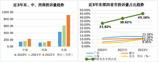 從近三年趨勢看,因平臺經(jīng)濟的跨區(qū)域擴張、人口資本的跨區(qū)域流動、市場要素的跨區(qū)域配置,廣東、浙江、上海、北京4個省市的消費正在加速集聚。消費投訴數(shù)量與消費活躍水平呈正相關(guān)關(guān)系,四省市消費投訴數(shù)量在全國的占比從2020年的31.8%增長到2022年的45.16%。消費投訴的加速集聚在一定程度上反映了消費供給側(cè)發(fā)展的不平衡,需要進一步恢復(fù)和擴大中西部地區(qū)消費,推動更高質(zhì)量、更加平衡的發(fā)展。