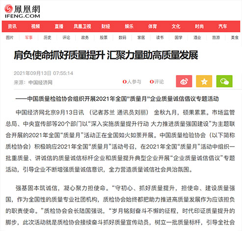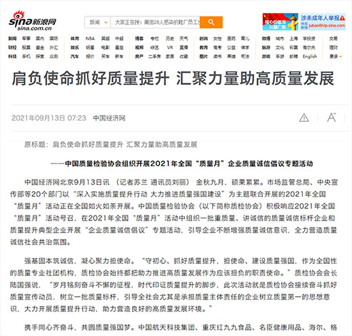 新浪網(wǎng):肩負(fù)使命抓好質(zhì)量提升 匯聚力量助高質(zhì)量發(fā)展——中國質(zhì)量檢驗協(xié)會組織開展2021年全國“質(zhì)量月”企業(yè)質(zhì)量誠信倡議專題活動