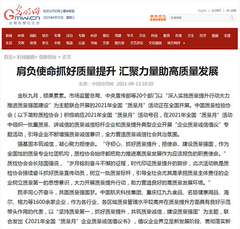 光明網(wǎng):肩負(fù)使命抓好質(zhì)量提升 匯聚力量助高質(zhì)量發(fā)展——中國質(zhì)量檢驗協(xié)會組織開展2021年全國“質(zhì)量月”企業(yè)質(zhì)量誠信倡議專題活動