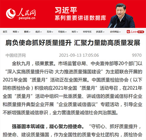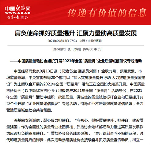 中國經(jīng)濟(jì)網(wǎng):肩負(fù)使命抓好質(zhì)量提升 匯聚力量助高質(zhì)量發(fā)展——中國質(zhì)量檢驗協(xié)會組織開展2021年全國“質(zhì)量月”企業(yè)質(zhì)量誠信倡議專題活動
