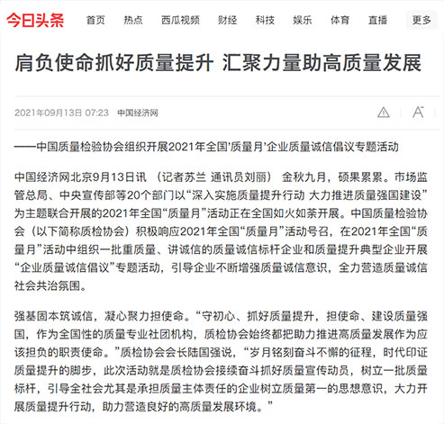 中國經(jīng)濟(jì)網(wǎng):堅持質(zhì)量第一 抓好質(zhì)量提升 共筑質(zhì)量誠信 建設(shè)質(zhì)量強(qiáng)國——2021年全國“質(zhì)量月”企業(yè)質(zhì)量誠信倡議書