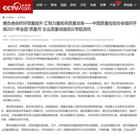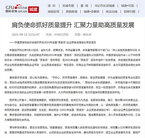 中央廣播電視總臺國際在線:肩負(fù)使命抓好質(zhì)量提升 匯聚力量助高質(zhì)量發(fā)展——中國質(zhì)量檢驗協(xié)會組織開展2021年全國"質(zhì)量月"企業(yè)質(zhì)量誠信倡議專題活動