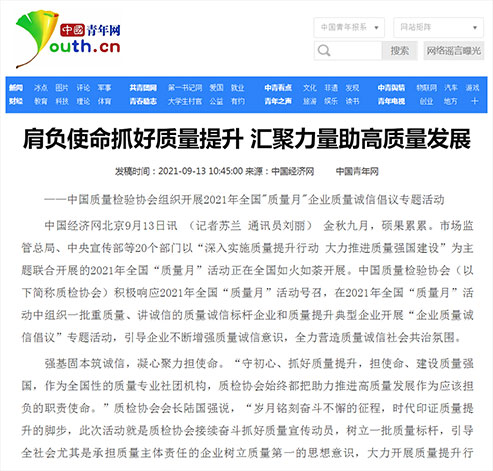 中國青年網(wǎng):肩負(fù)使命抓好質(zhì)量提升 匯聚力量助高質(zhì)量發(fā)展——中國質(zhì)量檢驗協(xié)會組織開展2021年全國"質(zhì)量月"企業(yè)質(zhì)量誠信倡議專題活動