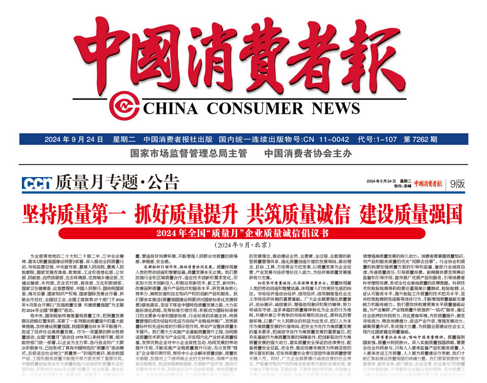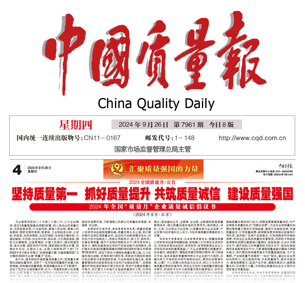 - 中國質(zhì)量報(bào)—堅(jiān)持質(zhì)量第一抓好質(zhì)量提升 共筑質(zhì)量誠信 建設(shè)質(zhì)量強(qiáng)國——2024年全國“質(zhì)量月”企業(yè)質(zhì)量誠信倡議書(2024年9月·北京)