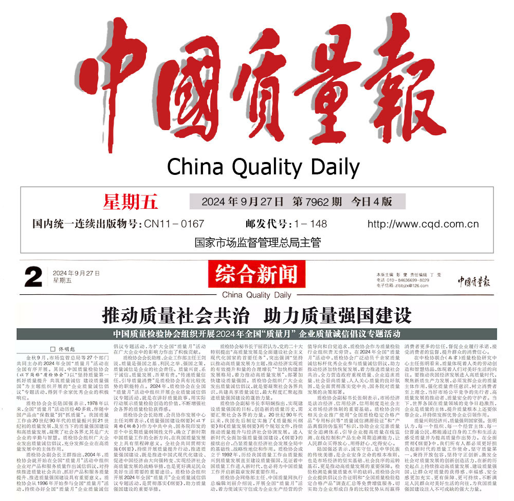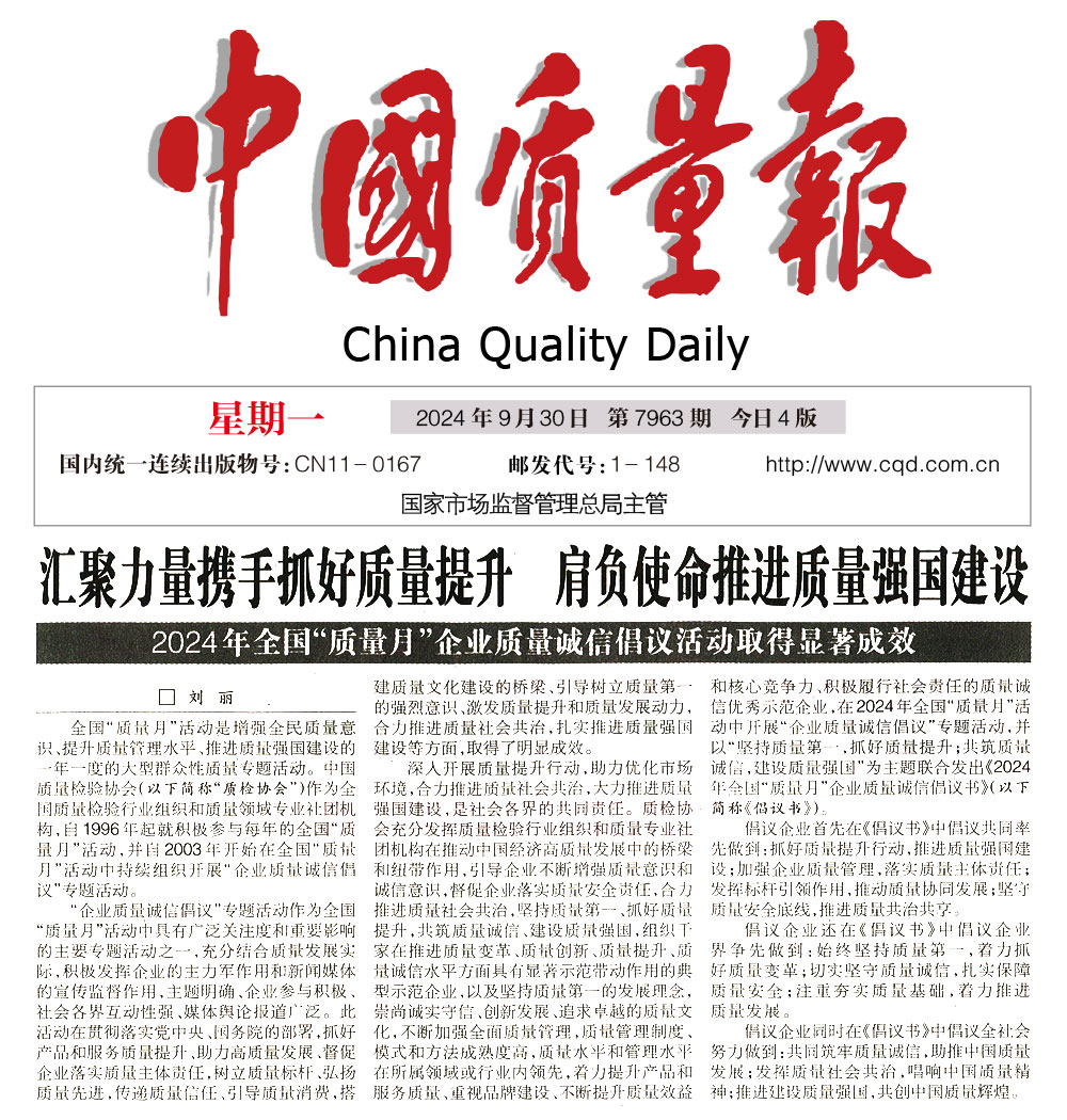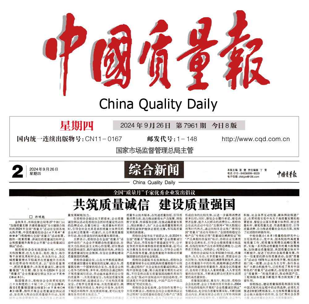 - 中國質(zhì)量報(bào)—堅(jiān)持質(zhì)量第一推動(dòng)質(zhì)量社會(huì)共治 助力質(zhì)量強(qiáng)國建設(shè)——中國質(zhì)量檢驗(yàn)協(xié)會(huì)組織開展2024年全國“質(zhì)量月” 企業(yè)質(zhì)量誠信倡議專題活動(dòng)