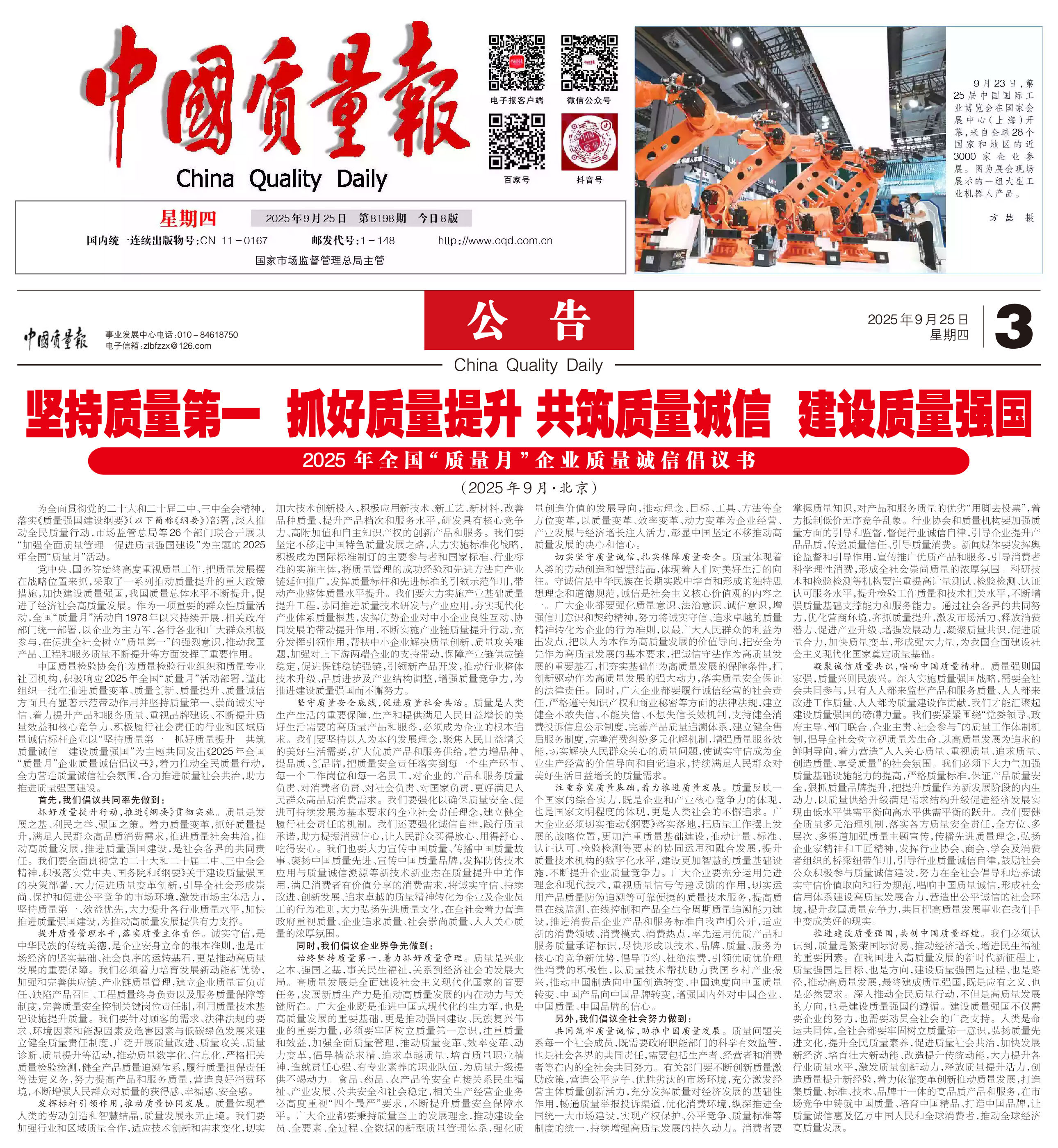 - 《中國質(zhì)量報(bào)》(2025年9月25日刊)發(fā)布:堅(jiān)持質(zhì)量第一 抓好質(zhì)量提升 共筑質(zhì)量誠信 建設(shè)質(zhì)量強(qiáng)國——2025年全國“質(zhì)量月”企業(yè)質(zhì)量誠信倡議書(2025年9月·北京)