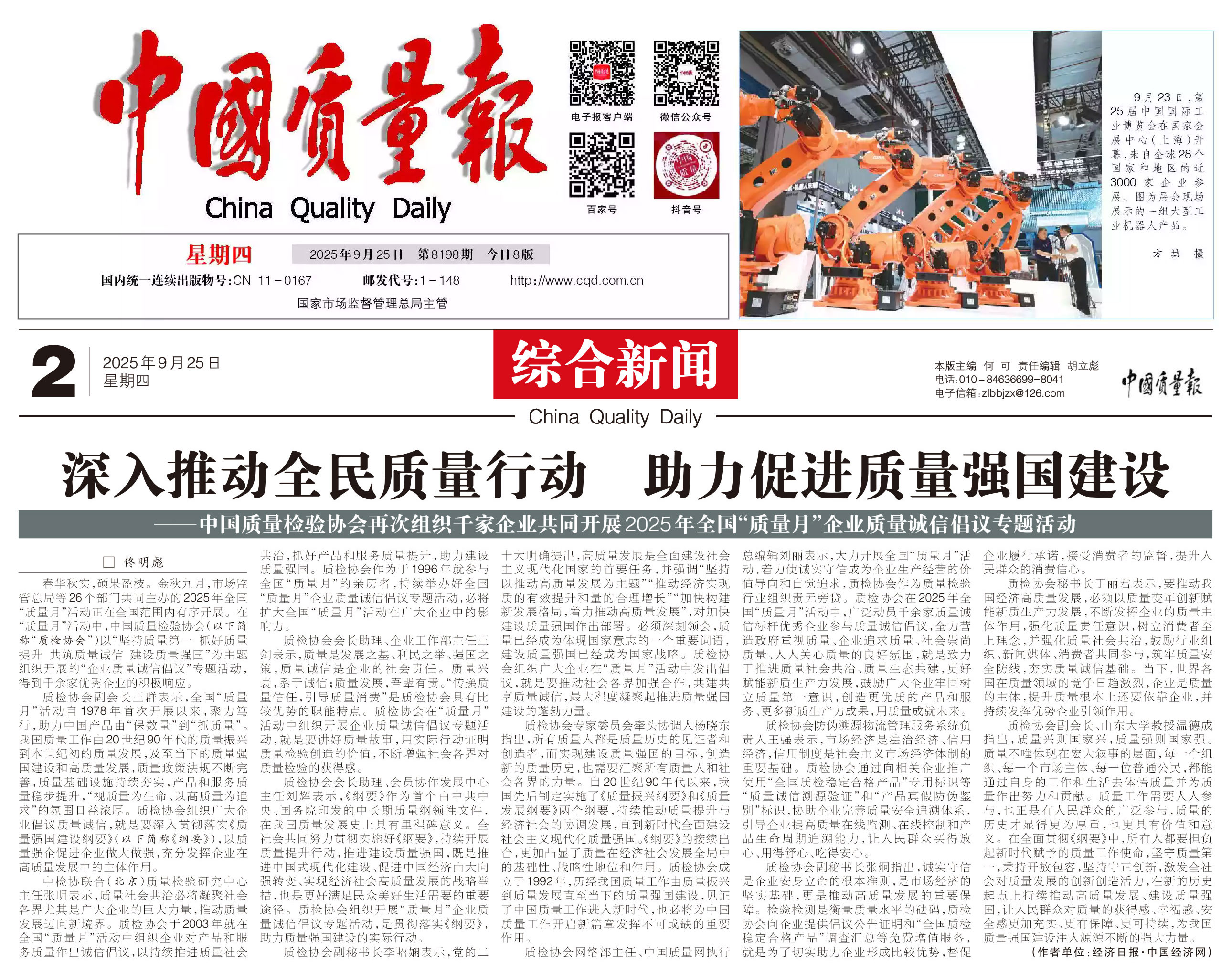 - 《中國質(zhì)量報(bào)》(2025年9月25日刊)發(fā)布:深入推動(dòng)全民質(zhì)量行動(dòng) 助力促進(jìn)質(zhì)量強(qiáng)國建設(shè)——中國質(zhì)量檢驗(yàn)協(xié)會(huì)再次組織千家企業(yè)共同開展2025年全國“質(zhì)量月”企業(yè)質(zhì)量誠信倡議專題活動(dòng)